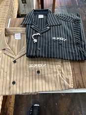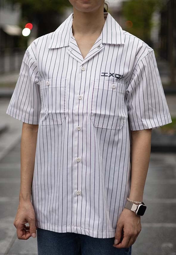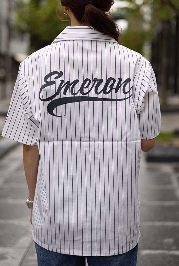 ストライプがかっこいい開襟シャツにエメロンのロゴを入れました!